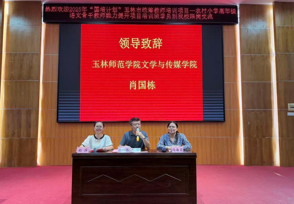 典礼上,肖国栋详细介绍了“国培计划”的背景与意义。他指出,“国培计划”自2010年由教育部、财政部联合启动,至今已走过15年历程,核心目标是提升中小学及幼儿园教师队伍素质,尤其聚焦农村教师能力建设,对推动基础教育均衡发展、深化教育改革、提高教育质量具有关键作用。我校自计划实施之初便积极参与,承担了中小学教师置换脱产研修、中小学骨干教师集中培训等各级各类国培项目,凭借扎实的工作成效获得自治区教育厅高度认可,目前全区初中和小学阶段的国培项目学校均参与承办实施。谈及本次培训,肖国栋介绍,项目采用“集中培训、跟岗研修+返岗实践”两阶段(含网络研修)模式。第一阶段集中培训期间,依托语文教学研究学科优势,整合区内外优质教育资源,特邀教育部国培计划专家库专家李福灼教授、全国年度十大名师郑梨花、全国模范教师王传贤等知名专家与一线教学名师授课,为学员带来前沿教育理念与实用教学方法,让学员们收获满满。在跟岗研修环节,组织学员前往南宁经开区第一小学、百花岭路小学,通过名师“传帮带”、课堂观摩、实践反思等形式,切实提升学员的语文教研与教学实践能力。第二阶段,学员在带教导师指导下,学以致用,开展教学实践研究,在返岗研修过程发挥示范骨干辐射作用,同时实现教学能力的质的飞跃。肖国栋寄语学员,希望大家认真总结培训所得,将所学知识与方法灵活运用到日常教学中,助力玉林市小学语文教师队伍整体素质提升;也欢迎学员们对培训工作提出宝贵意见,以便未来进一步优化培训方案。