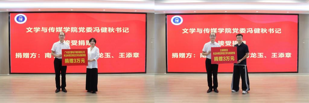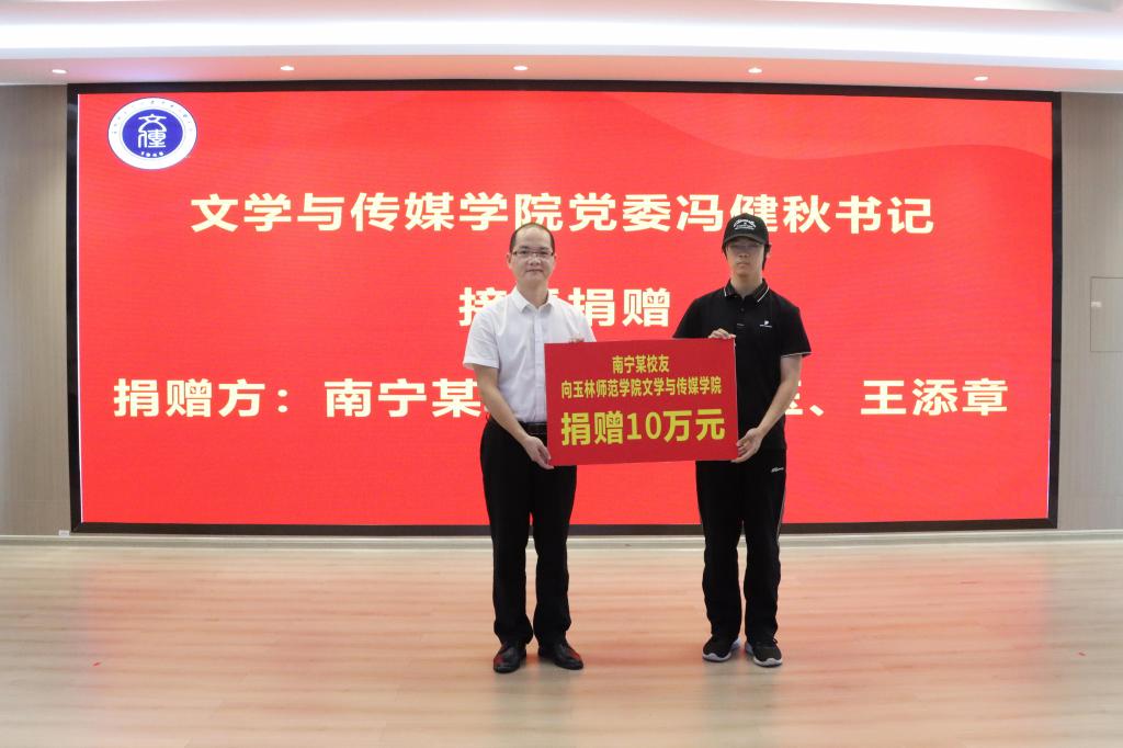本站讯 9月25日下午,文学与传媒学院在崇德楼路演大厅举行校友捐赠仪式。在南宁校友之家和广东校友之家的推动下,南宁某校友捐款10万元、蒋龙玉捐款3万元、王添章捐款3万元。校长李伟中,党委常委、宣传部部长徐一周,校友办、招生就业处、广东校友之家、文学与传媒学院相关负责人以及学生代表共同到场见证。