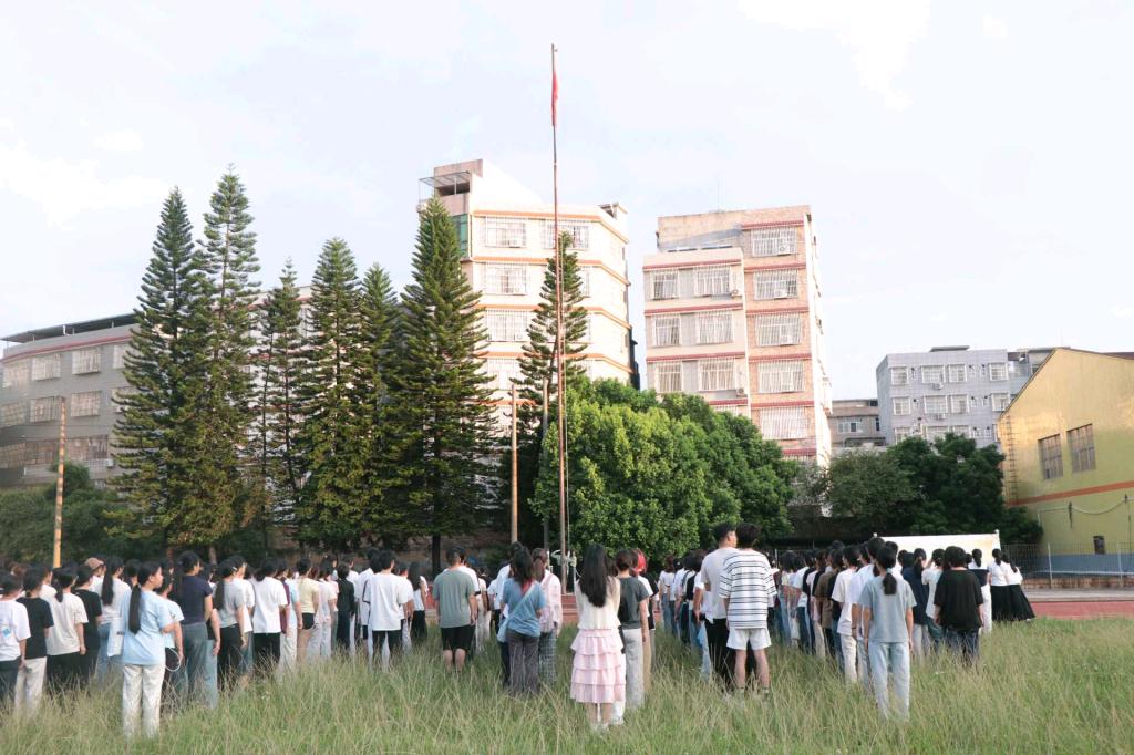 清晨7时,升旗仪式准时开始。国旗护卫队步伐稳健,护送国旗入场,在激昂的国歌中,五星红旗缓缓升起,全体师生庄严肃立,面向国旗行注目礼,并齐声高唱国歌。