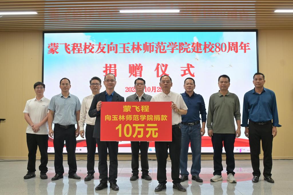 本站讯 10月29日,学校在贵港市清北高中举行校友捐赠仪式,蒙飞程校友向学校捐款10万元。文学与传媒学院党委书记冯健秋和众多校友到场参与,共同见证。