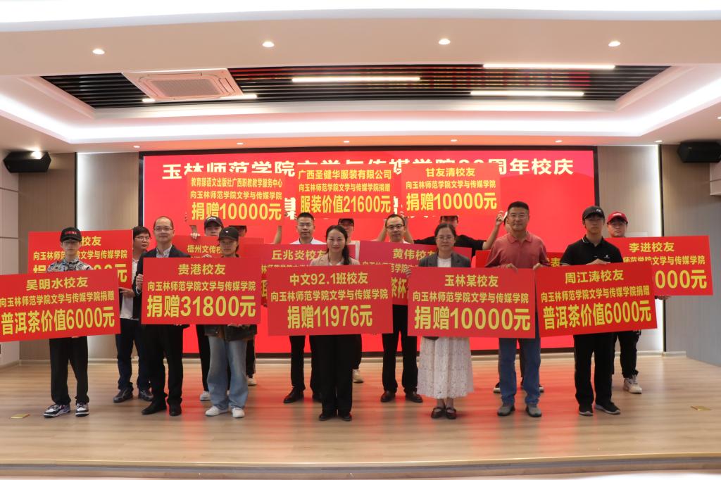在本次集体捐赠活动中,贵港校友捐款3.18万元,梧州校友捐款1万元、捐赠玉师建校八十周年庆典纪念六堡茶80盒价值1.112万元,中文921班校友捐款1.1976万元,李进校友捐款1万元,黄翔校友捐款1万元,甘友清校友捐款1万元,玉林某校友捐款1万元,教育部语文出版社广西职教教学服务中心捐款1万元,湛江校友代表捐款0.63万元,广西圣健华服装有限公司捐赠服装价值2.16万元,丘兆炎校友捐赠普洱茶价值1.2万元,黄伟校友捐赠坭兴陶茶杯价值1.08万元,吴明水校友捐赠普洱茶价值0.6万元,周江涛校友捐赠普洱茶价值0.6万元。在建校80周年的历史性时刻,校友们对母校培育表示感恩,并以集体捐赠的切实行动,为母校发展注入蓬勃力量。