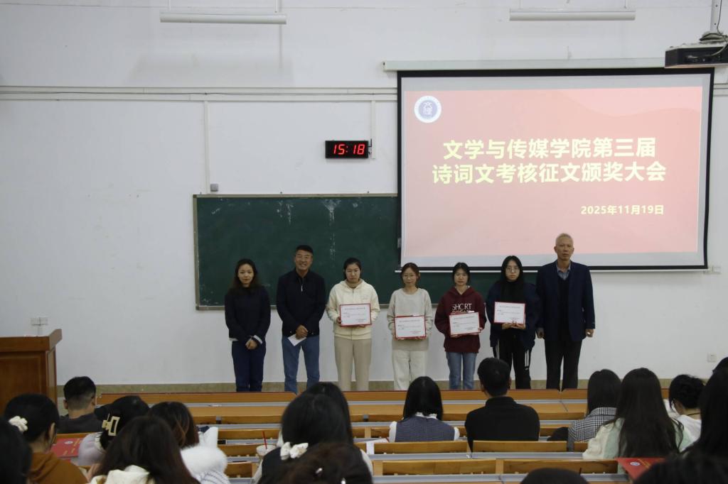 本站讯 为弘扬中华优秀传统文化,进一步激发同学们对古诗文的学习热情,11月19日下午,文学与传媒学院于东校区至善楼101教室开展第三届诗词文考核征文颁奖大会。本次活动由我院团委书记韦艳主持,院长肖国栋、教师梁驰华以及23级、24级中文系部分学生参加。