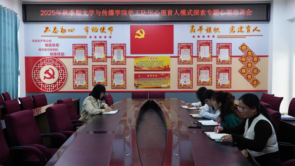 本站讯 为进一步探索新形势下心理育人工作的新路径、新方法,提升学工队伍心理健康教育工作的科学化与专业化水平,11月24日,文学与传媒学院成功举办了秋季学期学工队伍心理育人模式探索专题心理培训会。学院党委副书记邓荫金,全体辅导员参加了本次会议。
