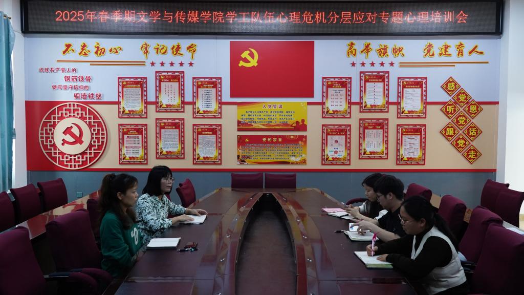 本站讯 为切实提升学院学工队伍的心理危机识别与干预能力,筑牢学生心理健康防线,4月14日,文学与传媒学院在东校区至善楼206教室开展春季期学工队伍心理危机分层应对专题心理培训会。学院党委副书记邓荫金,全体辅导员参加了本次培训。
