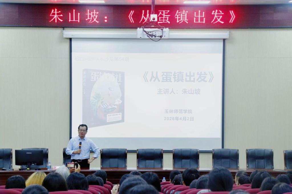 本站讯 4月2日晚,我院在西校区学术报告厅举办问津学术沙龙第五十四期,邀请玉林籍作家,广西作家协会副主席、广州文学艺术创作研究院专业作家朱山坡到场讲授《从蛋镇出发》主题讲座。讲座由我院院长肖国栋主持,玉林市文联副主席江舟、玉林市委宣传部相关科室负责人出席讲座,吸引玉林市不少文友到场聆听。