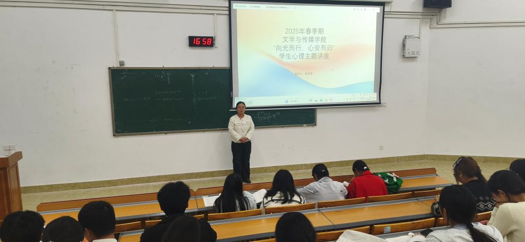 本站讯 为了一步提升我院学生心理调适能力,培育理性平和、积极向上的健康心态,2025年3月18日,文学与传媒学院在东校区至善308教室开展2025年春季期“向光而行,心安而归”学生心理专题讲座。
