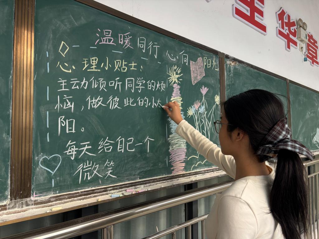 心灵的温暖传递,能为成长注入不竭动力。活动中,同学们紧扣“同行”核心,以黑板为媒介,将互助关怀的理念融入创意设计,用温情的文字、治愈的插画展现校园里的心理支持力量,既普及了人际互助的心理知识,又传递了“携手同行,共沐暖阳”的正能量。此次活动不仅为同学们提供了创意表达的舞台,更推动形成了“彼此关怀、共同成长”的校园风尚,助力文传学子在温暖陪伴中驱散心灵阴霾,以阳光心态拥抱生活。