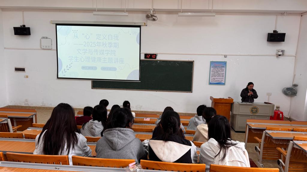 本站讯 为深入关注大学生心理健康发展,引导学生正确认识自我、悦纳自我,提升心理调适能力,12月16日,文学与传媒学院在东校区至善楼308教室了秋学期“从‘心’定义自我”学生心理健康主题讲座。本次讲座由我院辅导员秦芳莹主讲,学生代表参加。