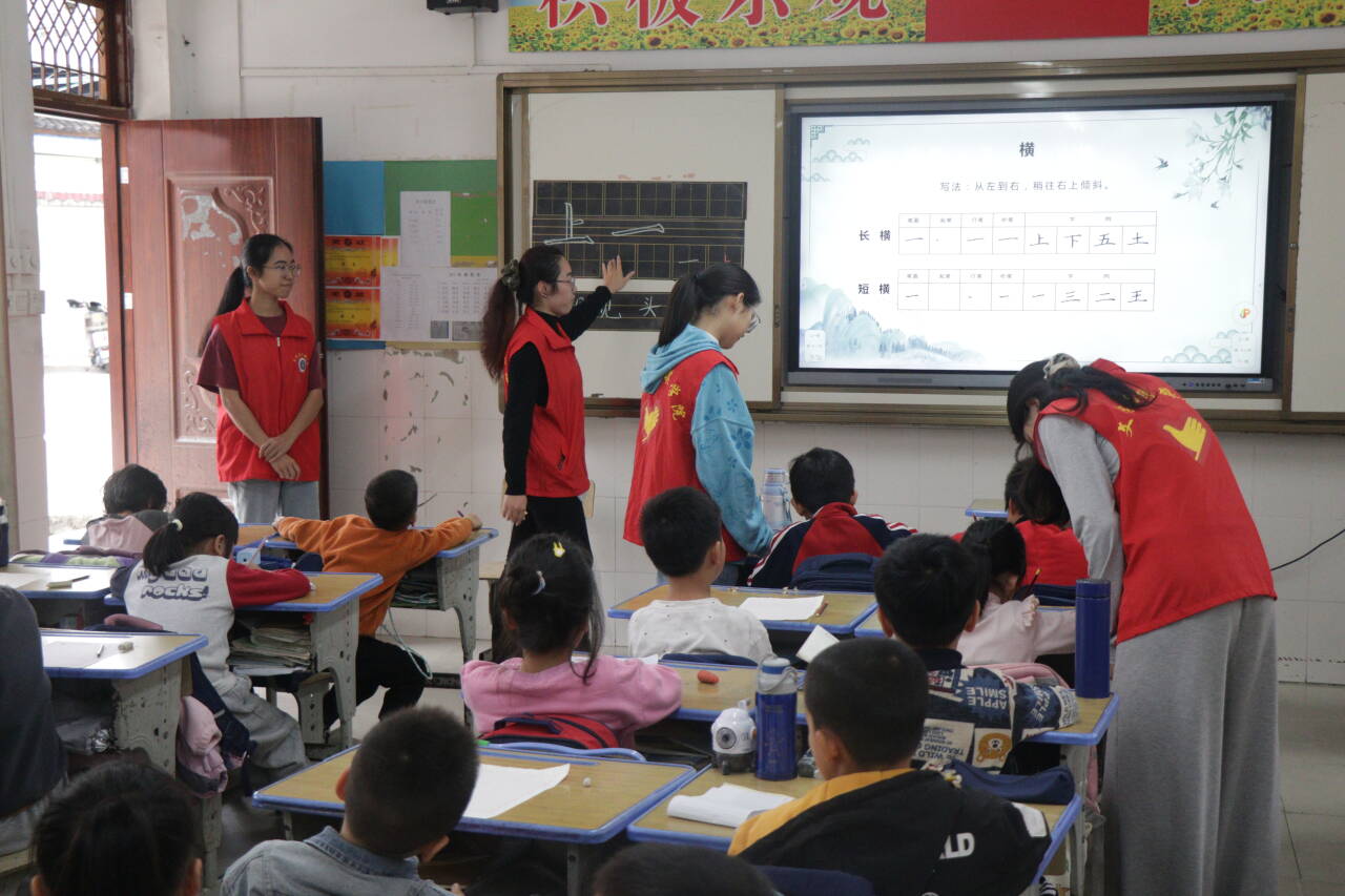 硬笔书法课堂上,志愿者教师细致讲解起笔、行笔、收笔的技巧,引导孩子们在一撇一捺间感受汉字的形体之美。孩子们握着铅笔,在田字格中认真书写“一”“十”“土” 等汉字,墨香与求知的目光交织成最美的课堂风景。动笔练习过程中,志愿者们来到学生身边进行坐姿和握笔姿势纠正,并手把手带领学生对“横”,“竖”等基本笔画进行练习。