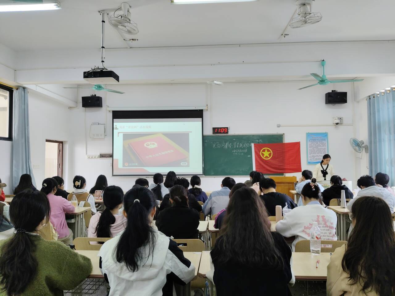会上,各班团支书为学生们介绍全国法制宣传日暨国家宪法日的由来与意义,阐明宪法作为根本大法的重要地位。随后,各班组织开展“我心中的宪法”主题分享会,学生们积极分享自身与宪法的故事,共同学习重要宪法条文,加深对宪法的认识。并播放专题视频,倡导学生们在日常生活中要尊法守法,自觉将法律信仰转化为具体行动,提升运用法律知识分析和解决实际问题的能力。